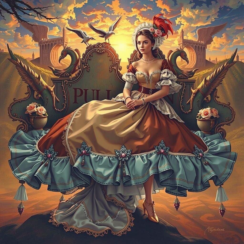 A figure in vintage clothing stands in the French countryside. The artwork evokes a Rococo style with soft light, intricate details, and a blend of realism and romanticism.