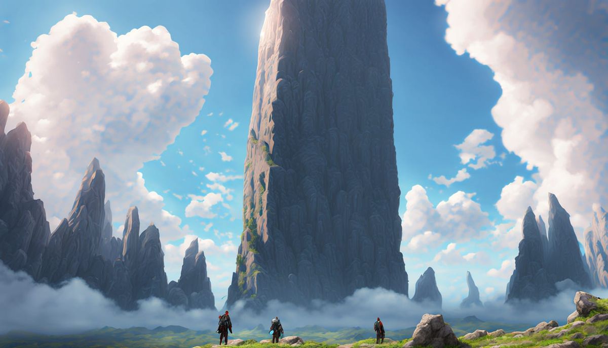 This image showcases a hyper-realistic, towering monolith piercing the sky. Rendered in a detailed 3D anime aesthetic, it features breathtaking concept art with ultrafine detail.