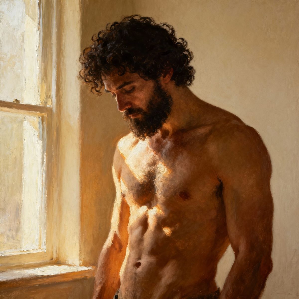 This image shows a contemplative, muscular man near a window, bathed in dramatic light and shadow. It features a painterly texture and deep impasto, evoking classical oil painting techniques.
