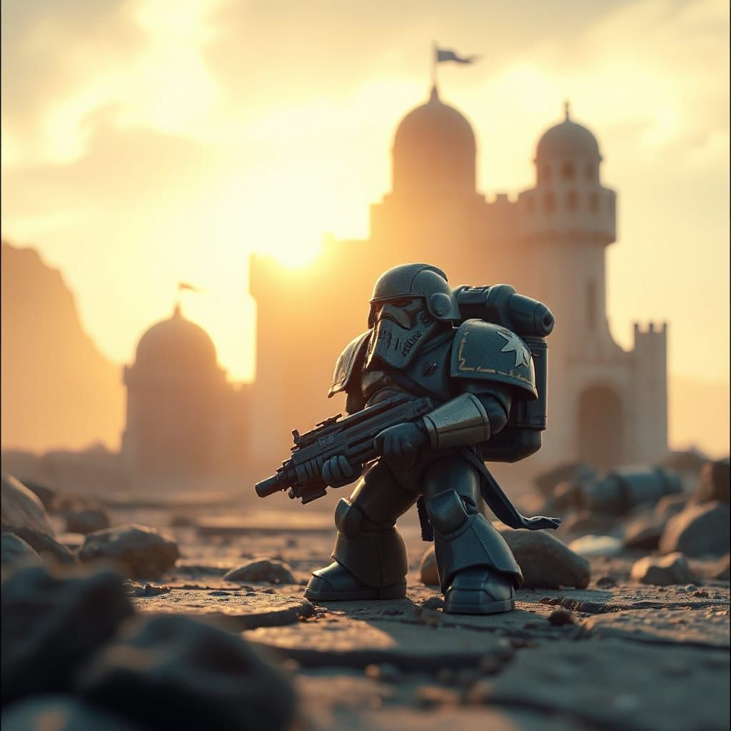 A small, stylized Ultramarine in power armor stands ready with bolter in a futuristic citadel. The image is bathed in warm sunlight with a grainy texture, capturing a moody atmosphere, as digital art.