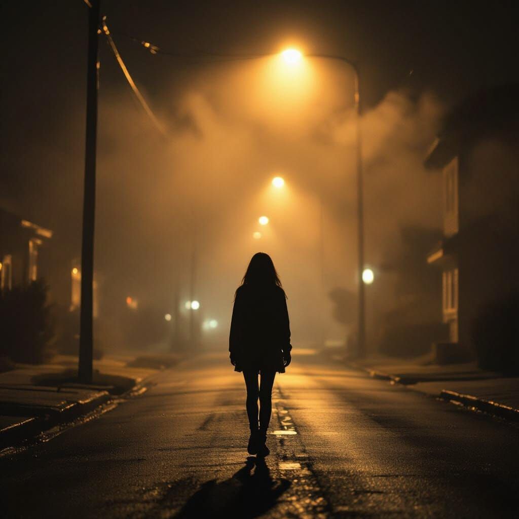A teenage girl walking alone on a dark deserted street at midnight, street lights flickering, strong wind blowing, eerie and foggy atmosphere, cinematic horror lighting, suspenseful mood, ultra realistic, 1280x720."