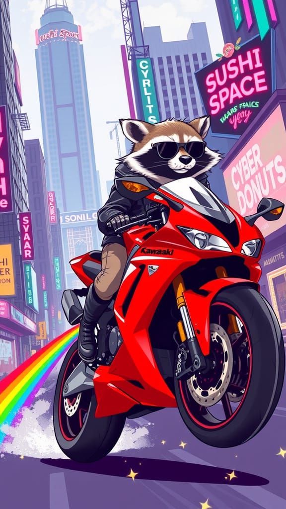 This image shows a happy raccoon on a sportbike performing a daring wheelie amidst a vibrant cyberpunk cityscape, with a whimsical twist of a floating front wheel and a radiant rainbow trail.