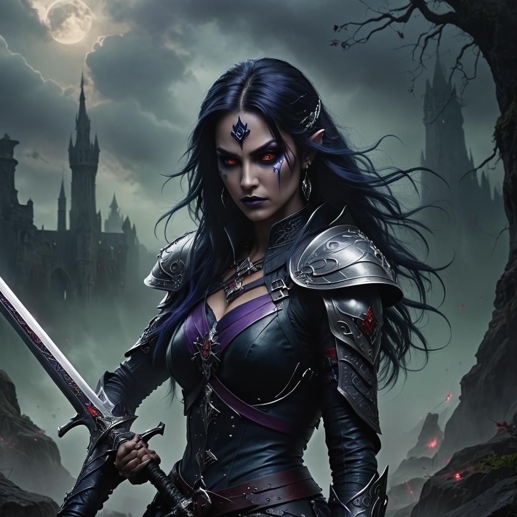 This image shows a female drow warrior with striking red eyes, adorned with mystical tattoos and dark armor. She wields a jagged sword amidst swirling dark mist, rendered with dynamic shadows in a fantasy style.