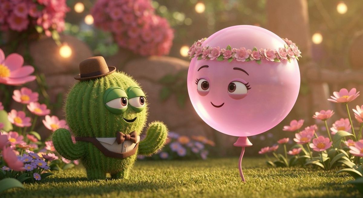 This charming 3D rendered scene features a cactus serenading a soap bubble in a vibrant garden. The endearing characters and soft lighting evoke a heartwarming, animated feel.
