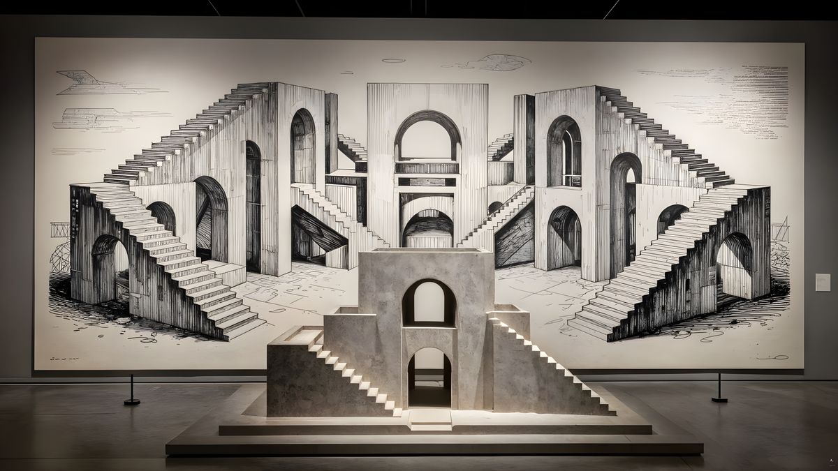 A museum-quality, Escher-inspired architectural concept presented at monumental scale: a massive black-ink architectural drawing on oversized archival paper mounted on a gallery wall, depicting impossible staircases, gravity-defying arches, and interlocking geometric forms. In front of it stands a large ...