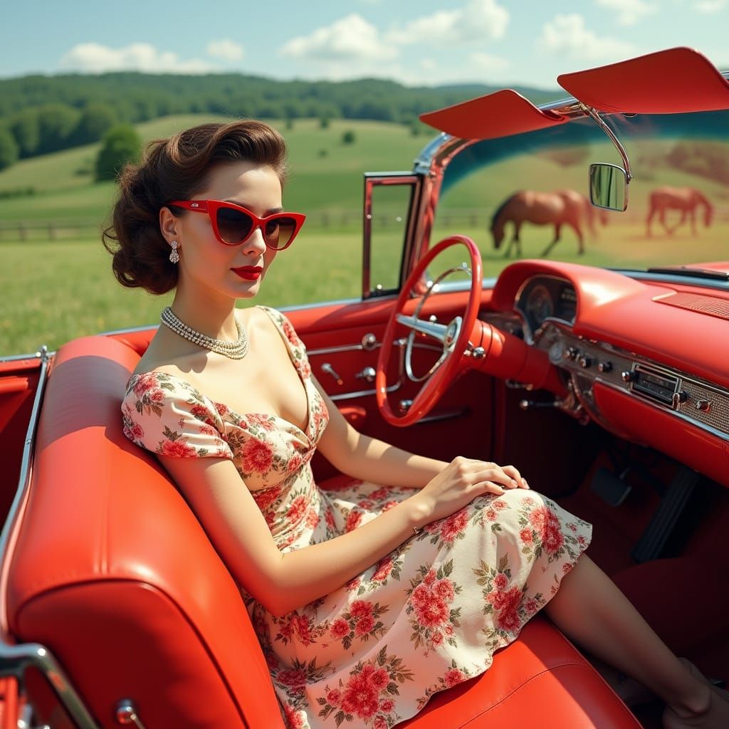 This image captures a refined 1950s socialite driving her iconic red convertible through the idyllic Virginia countryside, surrounded by rolling hills and majestic horses, in a scene reminiscent of classic American realism and sophisticated nostalgia.