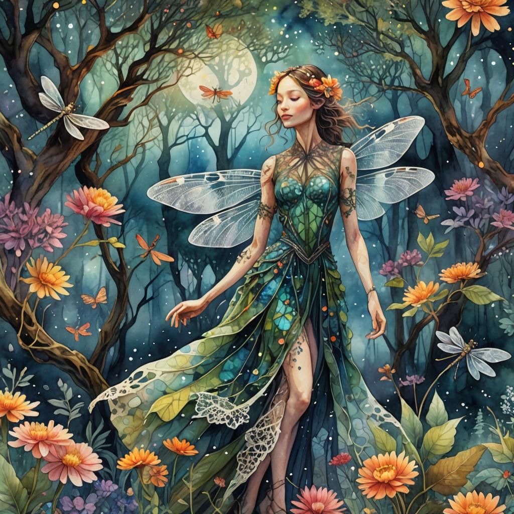 A striking picture of a dragonfly-human hybrid woman dancing in a magical forest. The watercolor illustration features fractal trees, vibrant flowers, and mystical creatures in a magic realism aesthetic.