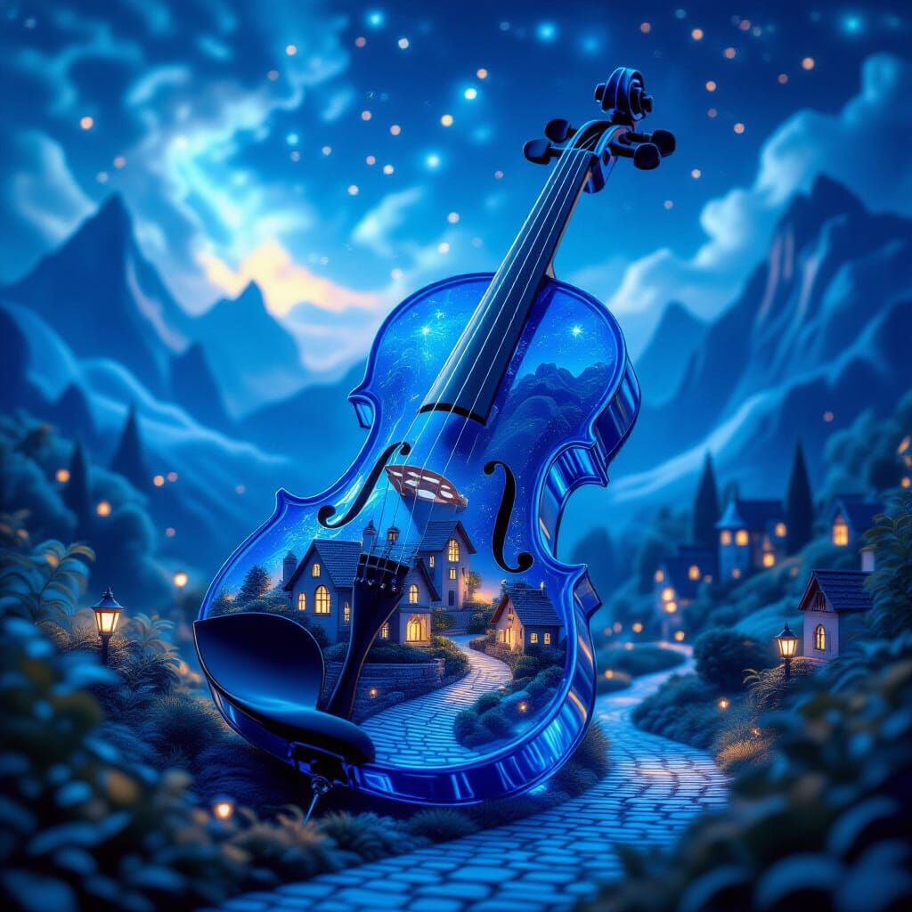 This image features a tiny, glowing village carved into a blue violin, set against a surreal, nebulae-filled background with luminous mountains, in a detailed fantasy style.