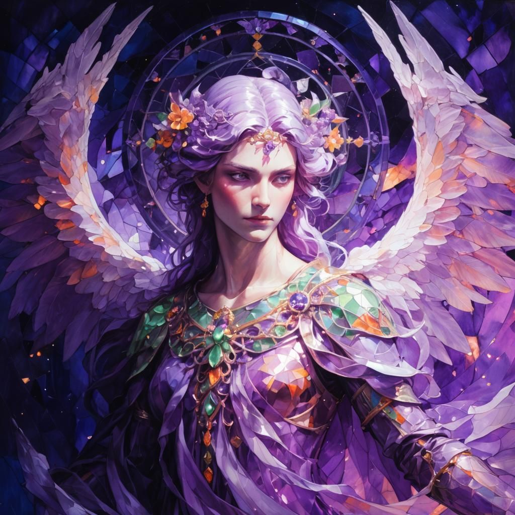 This image shows a vibrant stained glass artwork dominated by purple and green hues, accented with orange. The composition creates a mesmerizing display of light and color.