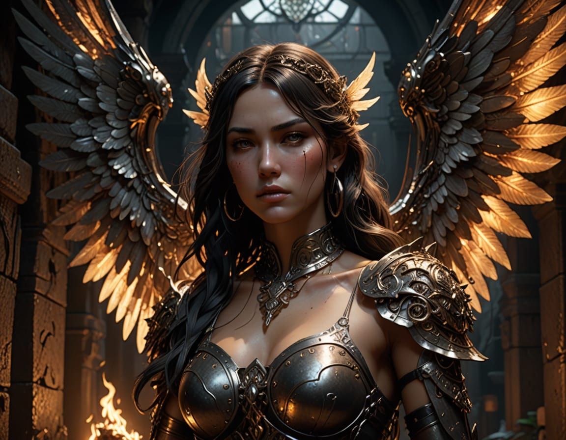 This image depicts a magical warrior woman imprisoned in a dungeon, rendered in a hyper-realistic digital matte painting style. Features include metallic wings, mystical symbols, and enchanted chains, with dramatic, cinematic lighting.