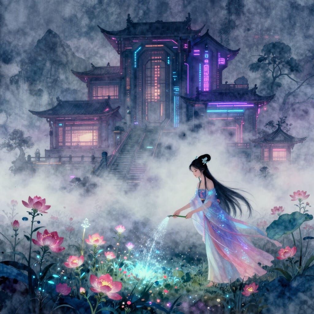 This image depicts a mystical East Asian fairy tending to glowing flowers before a futuristic cyberpunk mansion, rendered in a watercolor style with volumetric fog.