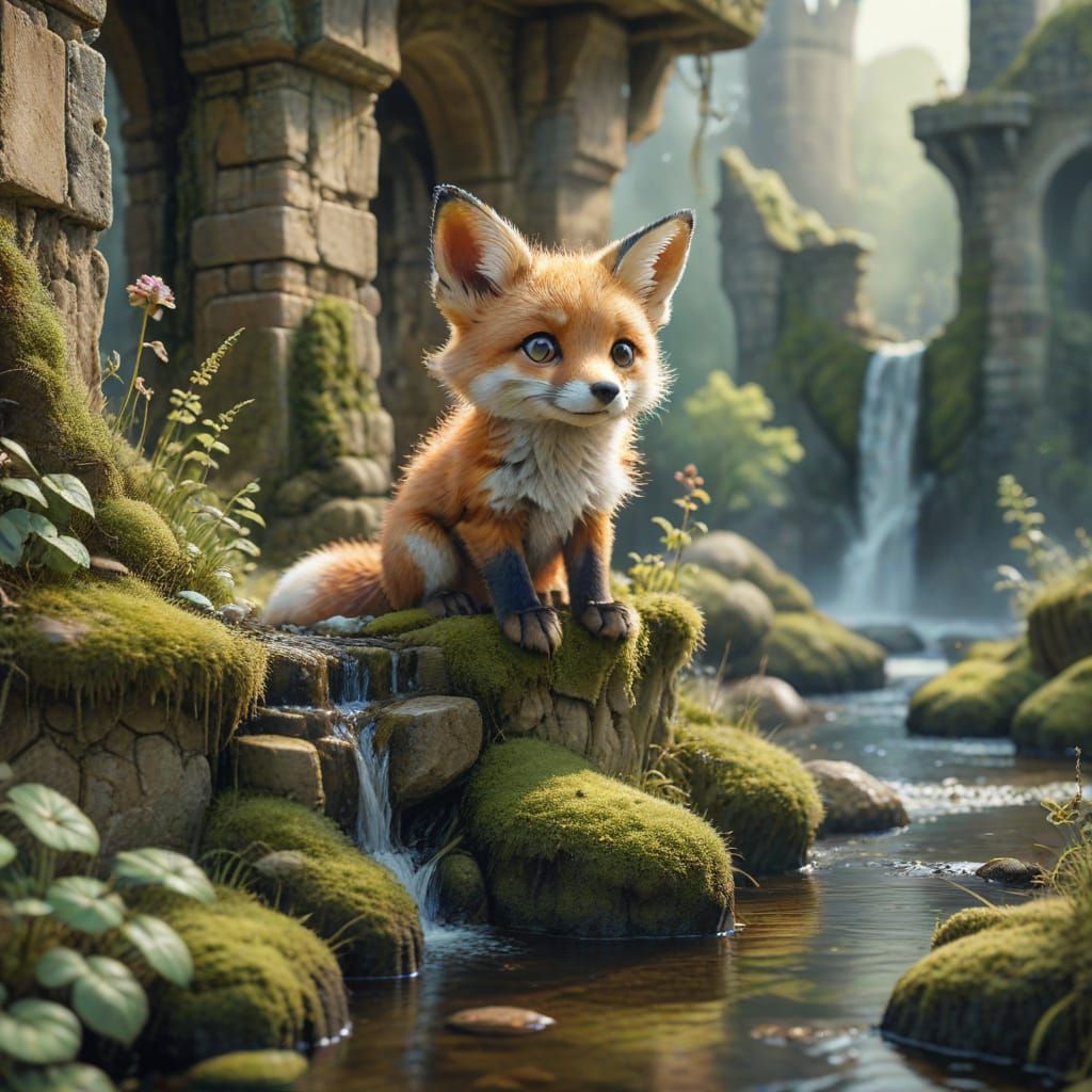 This image shows a watercolor painting of a furry fox cub with large eyes sitting on mossy castle ruins near a stream. The artwork features soft lighting and pastel colors in a whimsical aesthetic.
