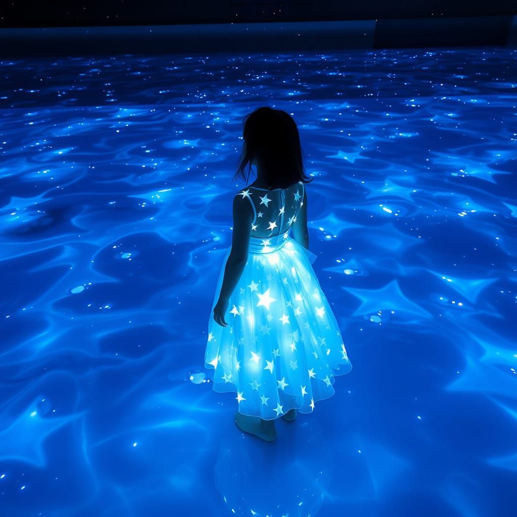This image shows a girl in a luminous blue dress standing near a bioluminescent ocean. The water glows like crystal, illuminating the scene with ethereal light.