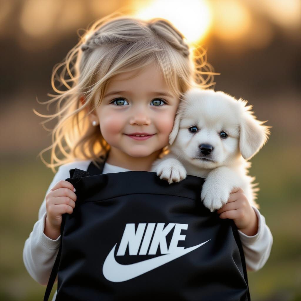 Realistic photo of a blonde toddler with blue-green eyes holding a black Nike bag. A small white puppy peeks out, captured with cinematic golden hour lighting and high detail.