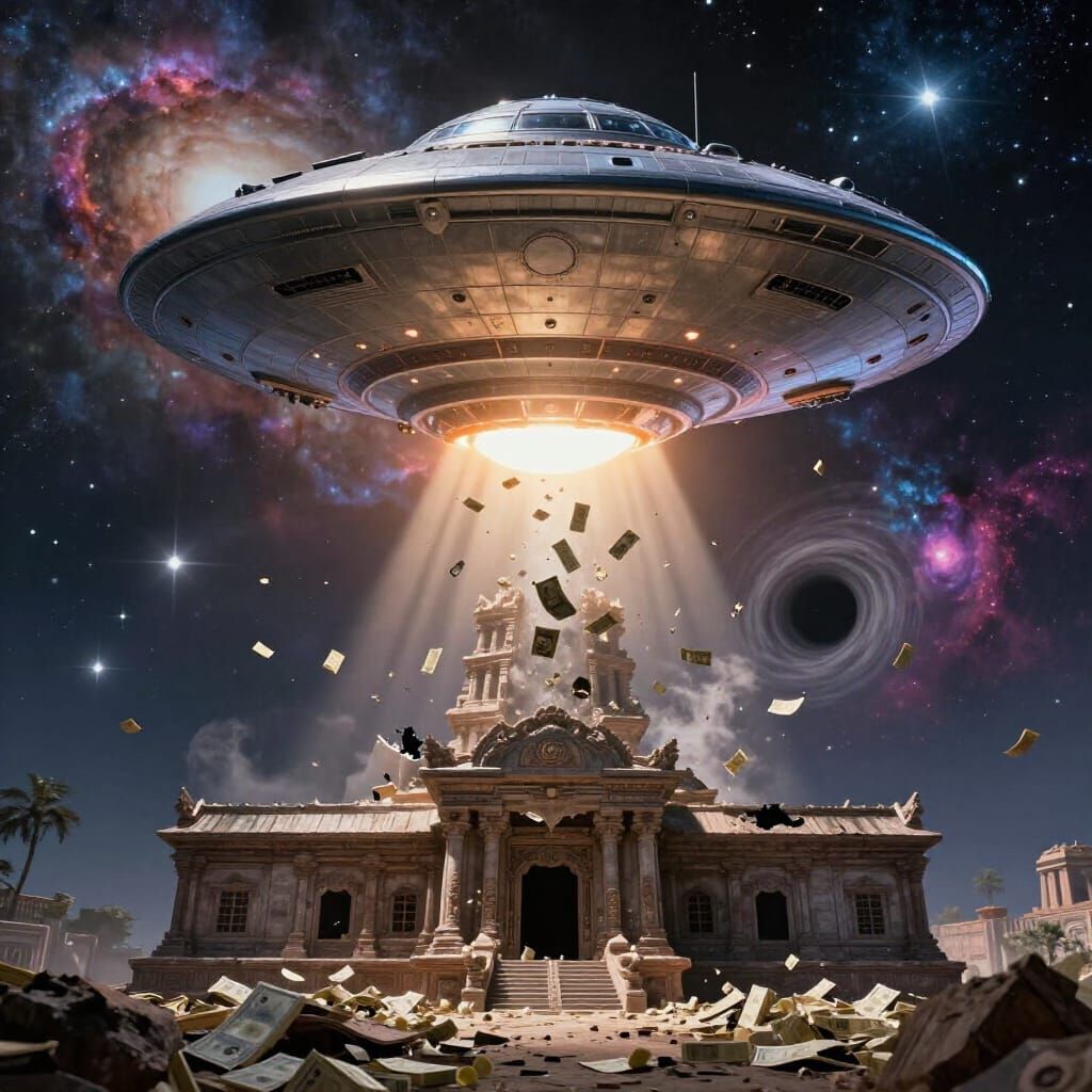 A realistic cosmic scene showing a metallic UFO abducting money over a broken moon temple. A black hole pulls the temple away against a vibrant galaxy background with cinematic lighting.