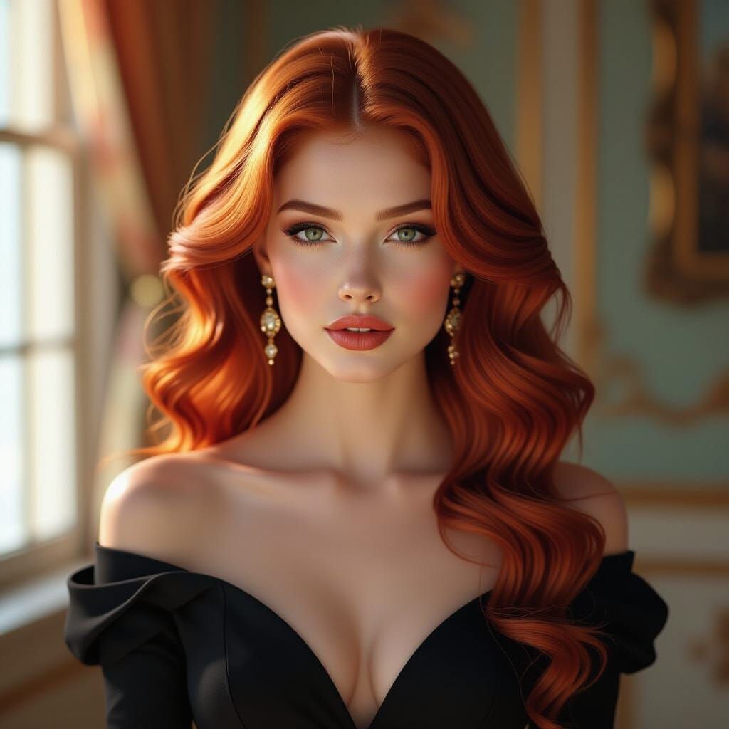 A captivating photograph in the style of Annie Leibovitz showcases a red haired young woman embodying sleek, fashion-inspired elegance, her long, wavy hair cascading around porcelain skin illuminated by warm, cinematic natural lighting.