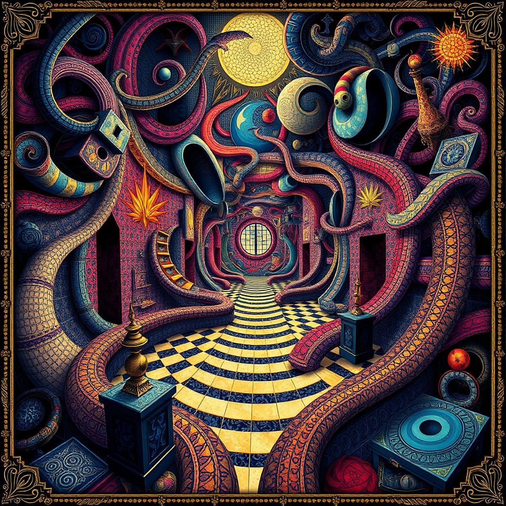 This vibrant art nouveau image depicts a surreal maze with intricate patterns, blending Cubist and psychedelic elements, set on a hidden chessboard grid, evoking the optical illusions of Bridget Riley and Victor Vasarely.