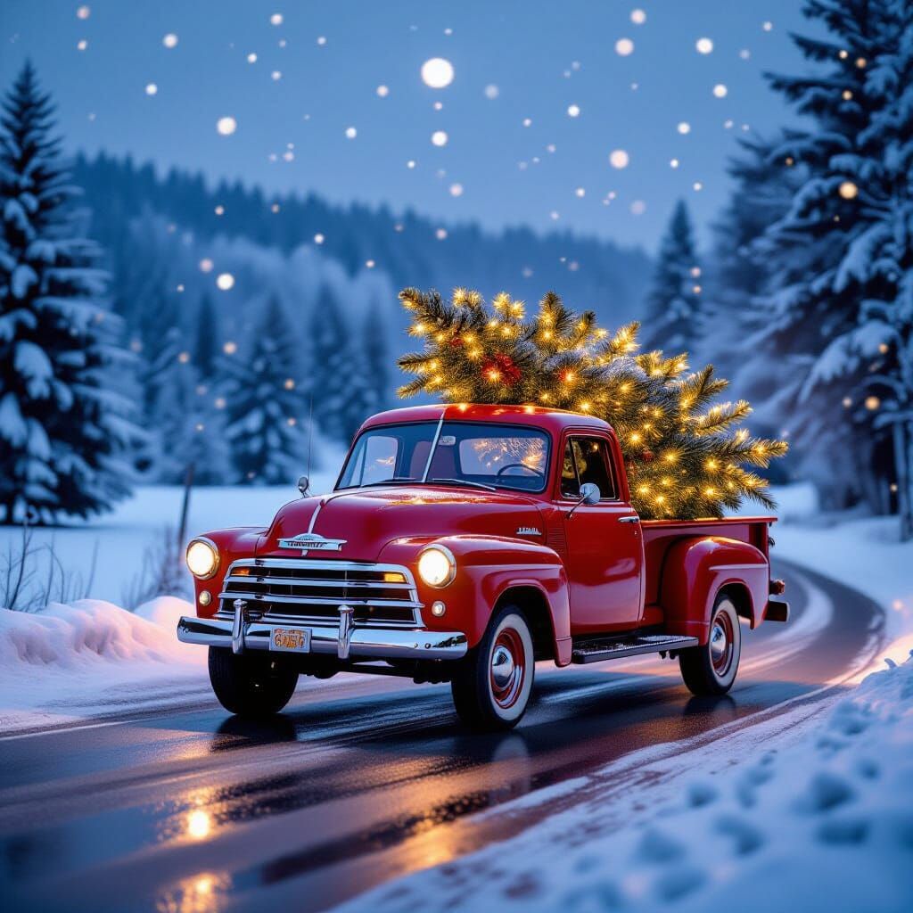 This photorealistic image shows a classic 1950s red pickup truck carrying a Christmas tree down a snowy road. Cinematic lighting and a wide-angle view create a festive, detailed holiday scene.