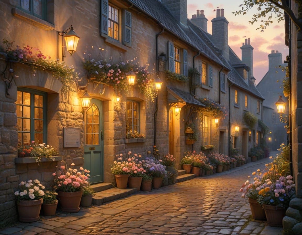 A watercolor illustration of a quaint cobblestone street in old England, lined with historic stone buildings and vibrant flower boxes. Softly glowing lanterns and a pastel color palette create a dreamy, romanticized atmosphere.