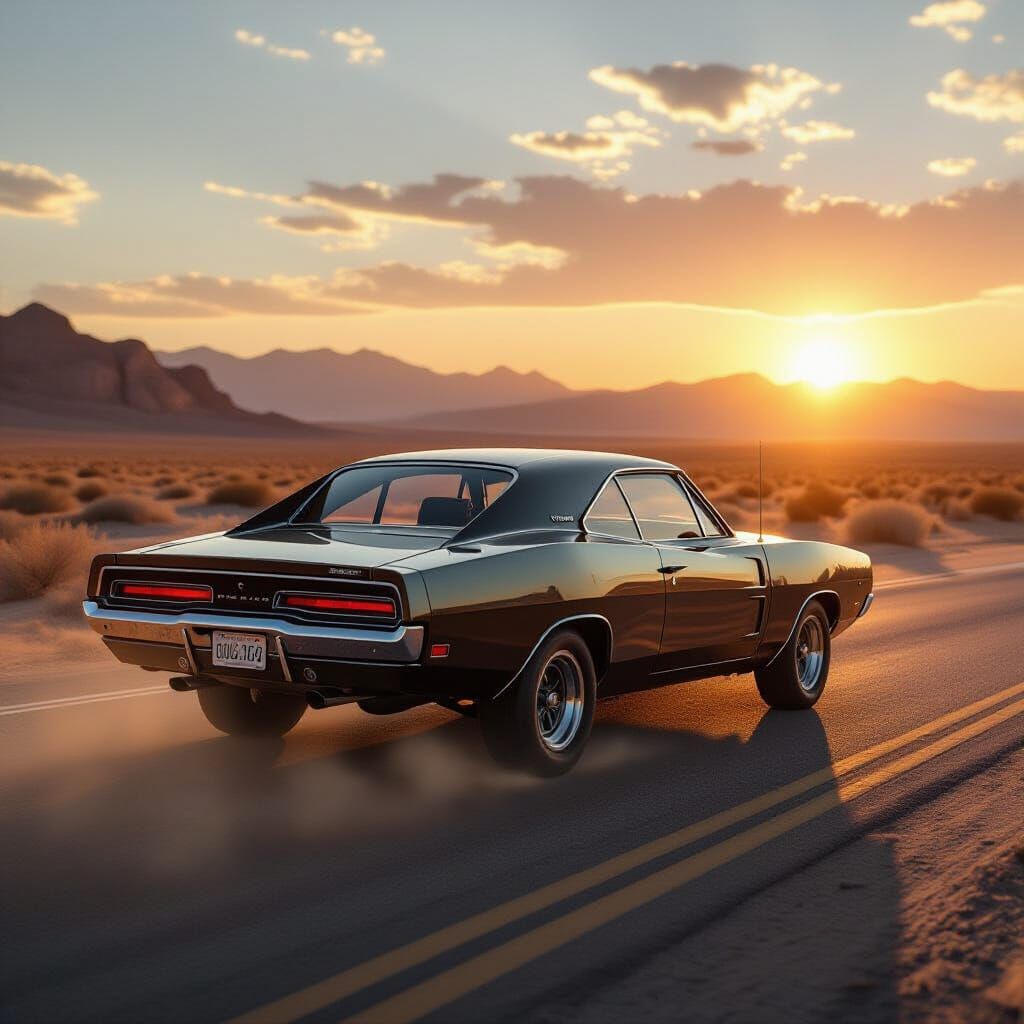 This photorealistic image captures a weathered 1969 Dodge Charger R/T on a dusty desert highway during golden hour. Cinematic lighting emphasizes its power and the freedom of the open road.