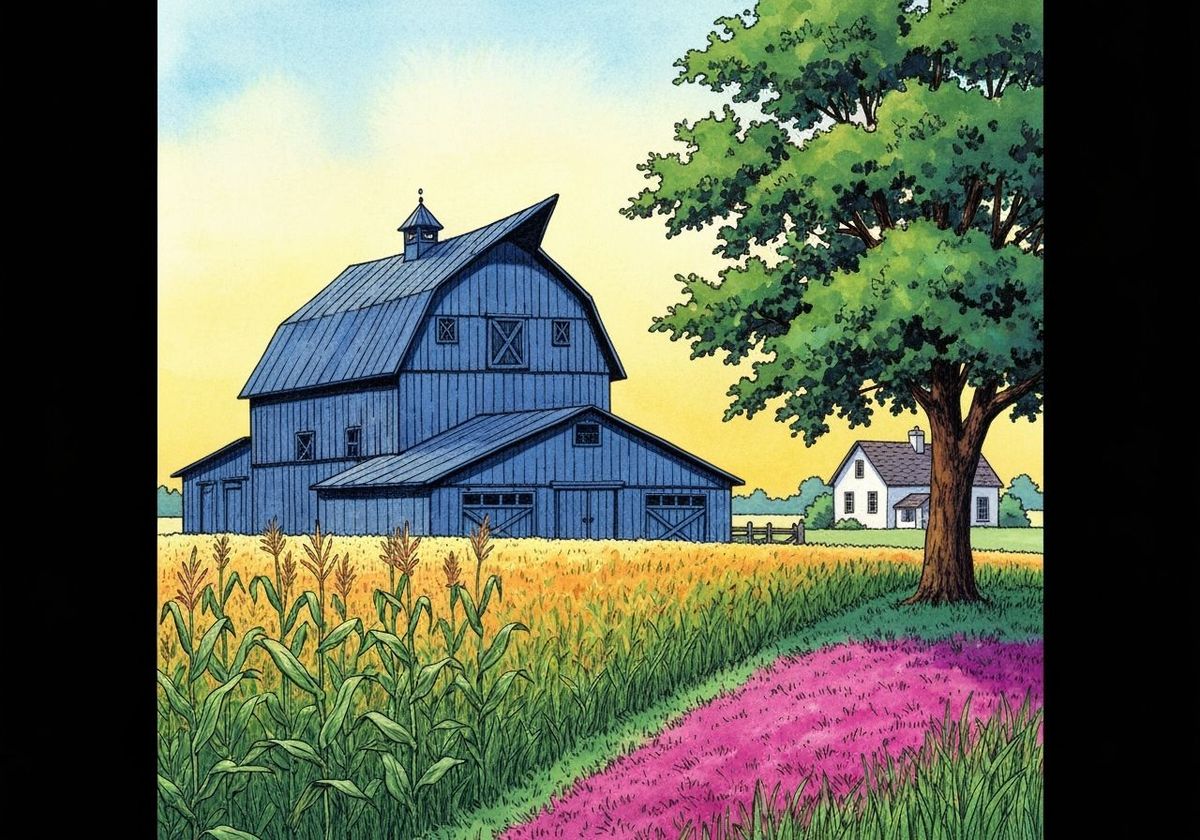 This image depicts a cheerful, quaint farmhouse surrounded by a cornfield and trees, adorned with Pennsylvania Dutch hex signs. Rendered in a bright, watercolor and gouache style with clear daytime light.