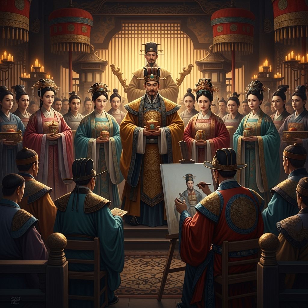 This image shows a coronation in ancient China with emperors, empresses, and courtiers in traditional robes. The scene is rich with gold, red, and blue hues, reminiscent of classical Chinese paintings.