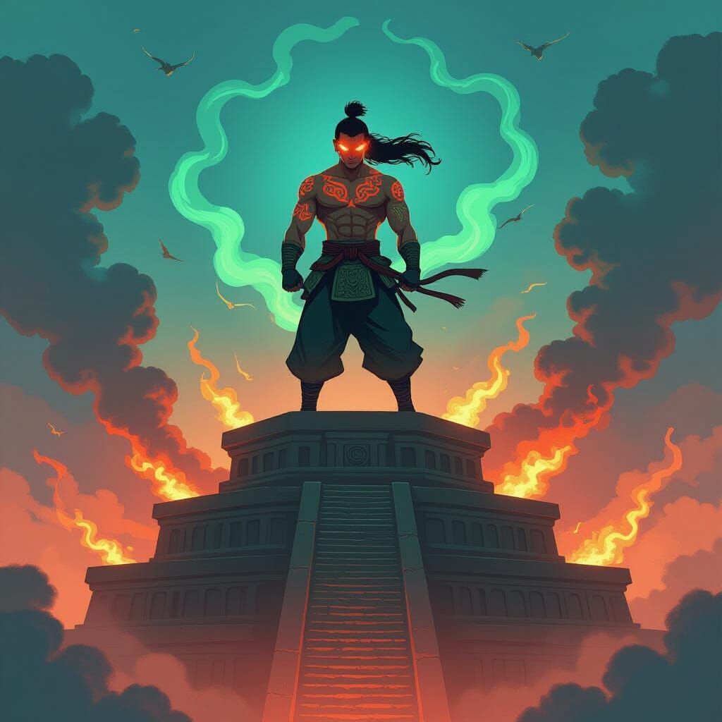 This image shows a Muay Thai warrior on a ziggurat, amidst swirling smoke. The artwork blends Thai art with futuristic anime style, using neon colors and dramatic lighting.