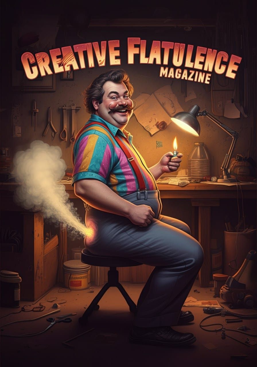 This image shows a jovial man in a colorful outfit mischievously igniting a cloud of gas. The scene is set in a cluttered workshop, with a playful, humorous style reminiscent of 1980s pop art.