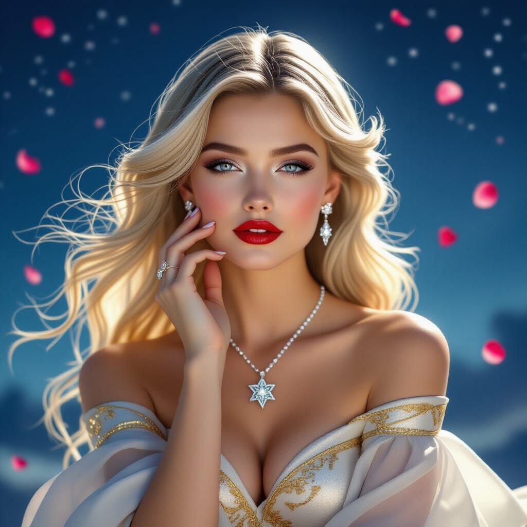 A striking picture of a fair goddess with long blonde hair, starlight, and ice-blue eyes. She wears a gold dress and silver jewelry against a night sky with falling rose petals, in a cinematic style.