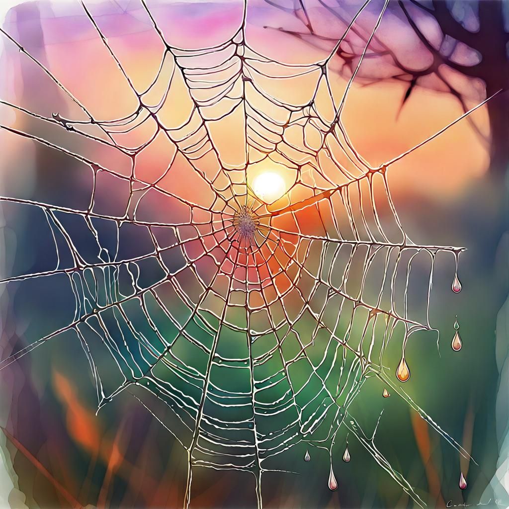 A vibrant digital watercolor painting capturing morning dew on a spiderweb in a fantasy landscape. The artwork features intense colors, water droplets, and soft, cinematic lighting.