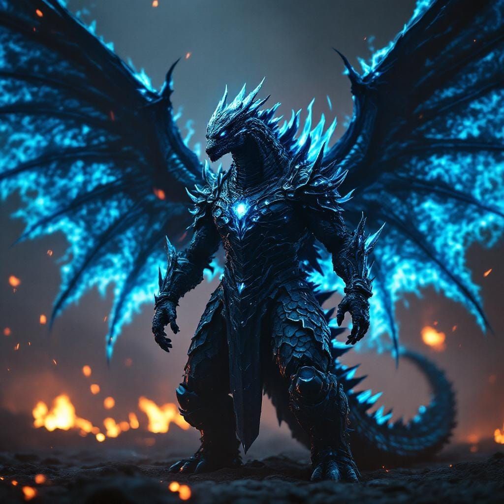 This image shows a Godzilla fairy adorned in detailed armor, its black wings ignited with electric blue fire. A cinematic and dramatic scene with film grain and a vignette, reminiscent of futuristic and mystical realism.