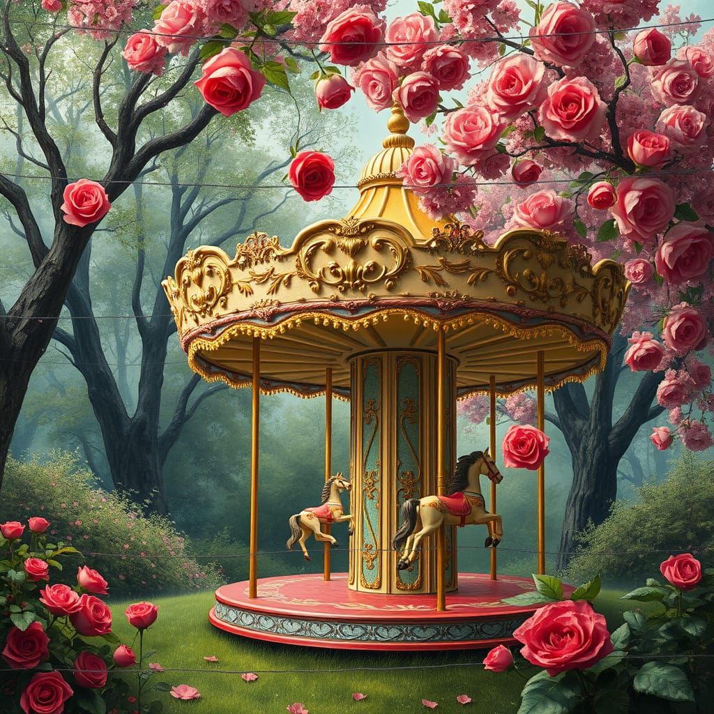 This vibrant, hyper-realistic painting depicts a surreal carousel set amidst lush greenery and towering trees, adorned with sparkling fairy lights and soft, velvety red and pink roses that fall gently from the sky. Inspired by the opulent world of classical opera, with a touch of drama and fantasy.