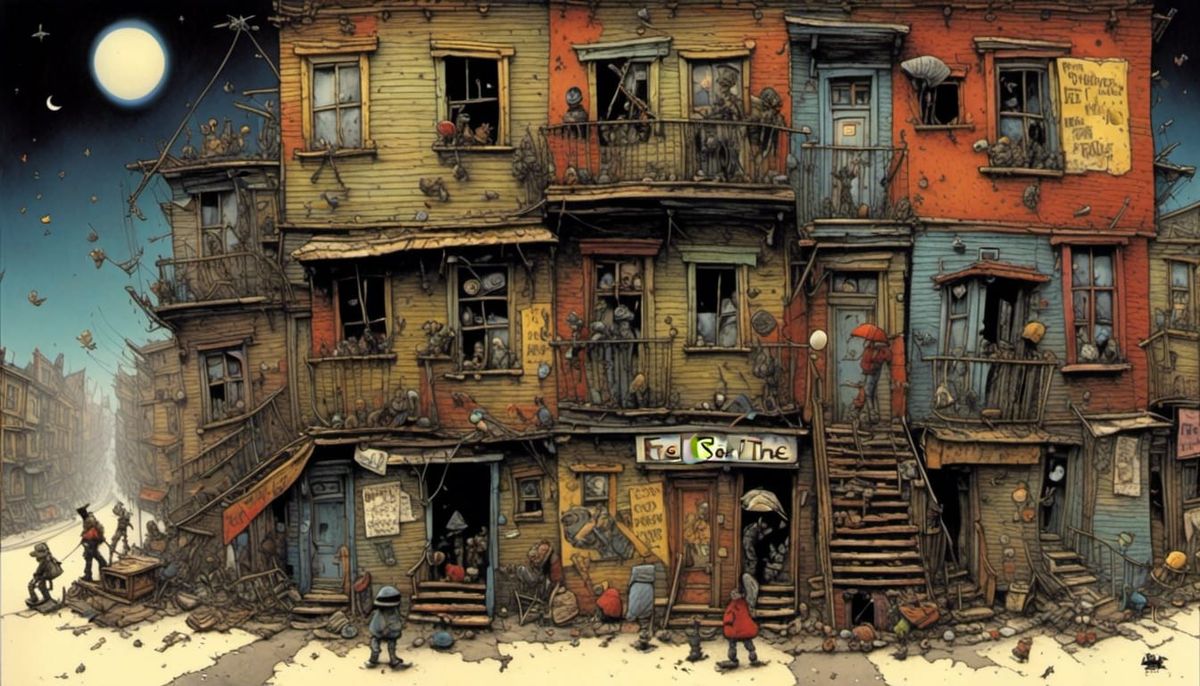 This image showcases a 2000s-era slum masterpiece. The image depicts a gritty urban landscape, reminiscent of a blend of street art and dystopian themes, in a graffiti art style.