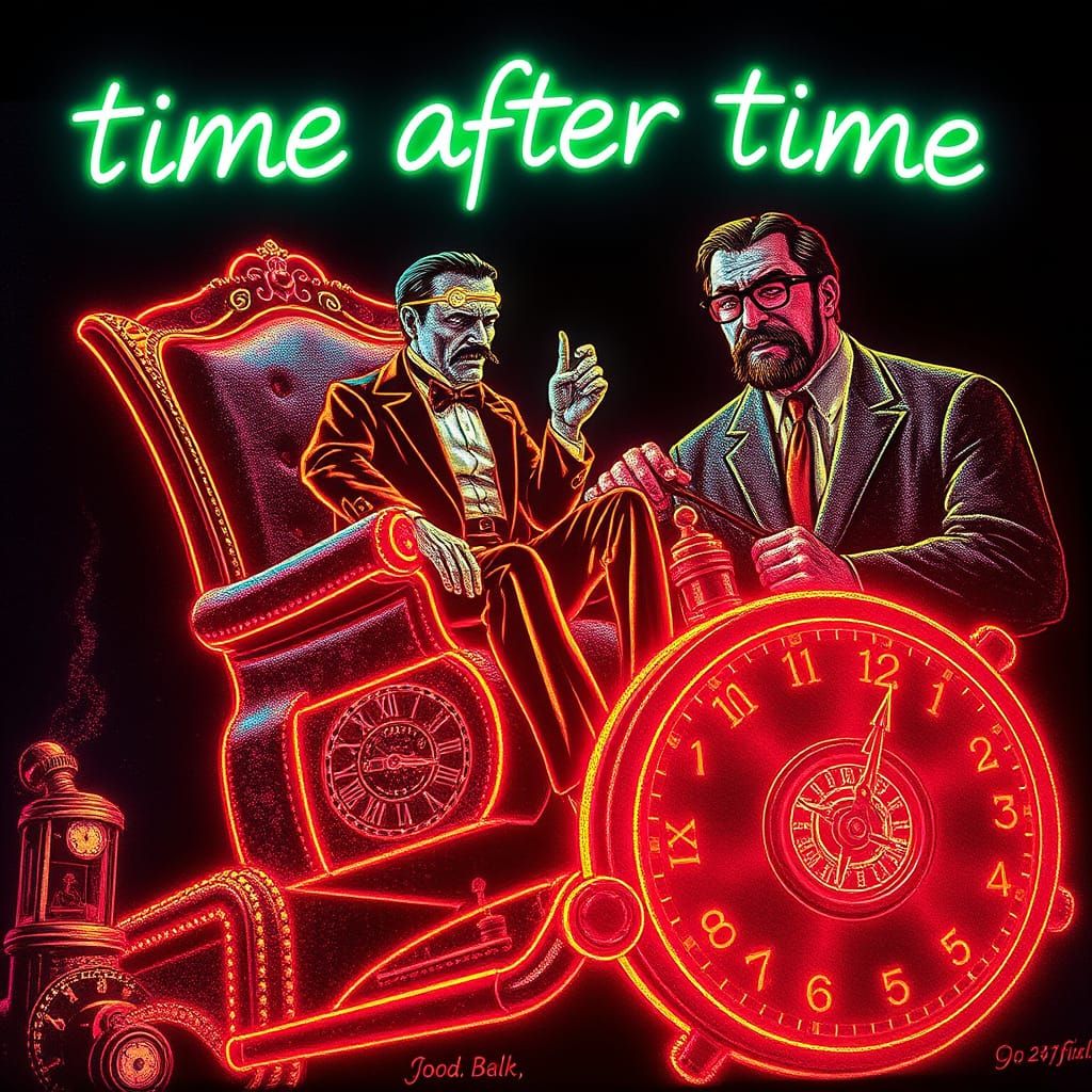 This image shows Jack the Ripper on a steampunk time machine, observed by a horrified H.G. Wells. The picture is reminiscent of Edward Gorey's style, with fluorescent colors and a cyberpunk aesthetic.
