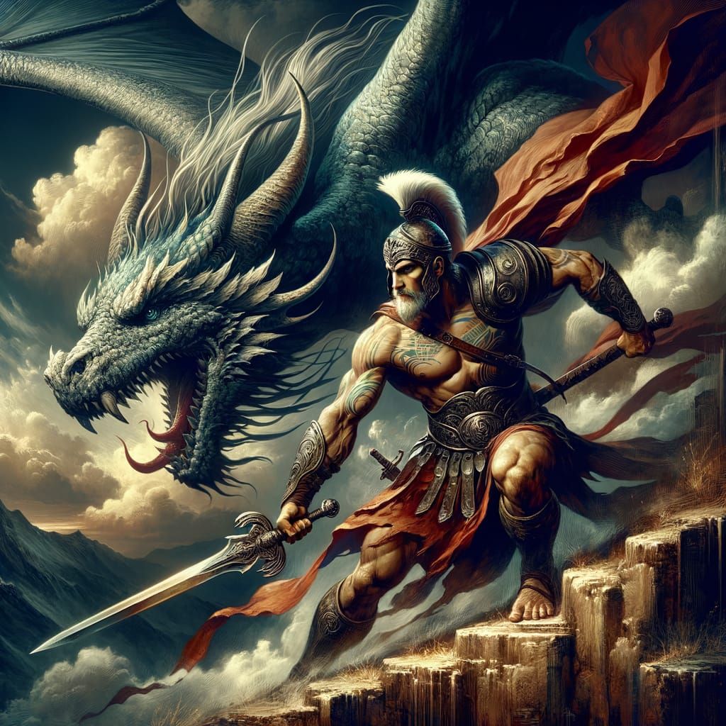 This image depicts a determined Roman gladiator confronting a dragon on a steep incline. Rendered in a dramatic, high-contrast epic fantasy concept art style with sharp detail.