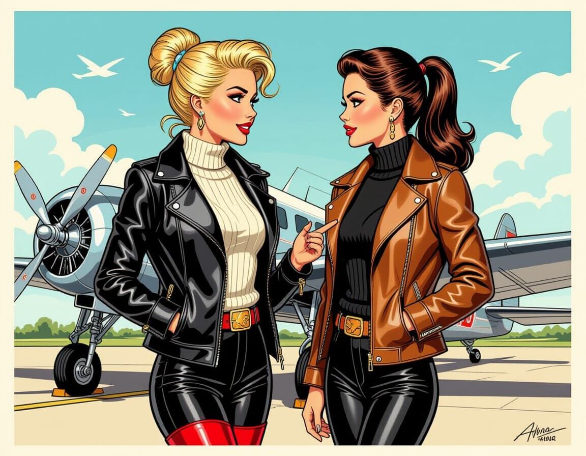 This image shows two attractive pilots in leather jackets chatting in front of a classic propeller plane. The artwork has a hand-drawn comic style with a Bronze Age aesthetic.