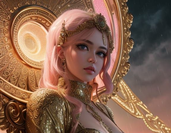 This image showcases a detailed oil painting of an ornate, golden cherub resting on a large, pink, glittery donut. The art style is whimsical and magical, with neon halos and raining sprinkles.