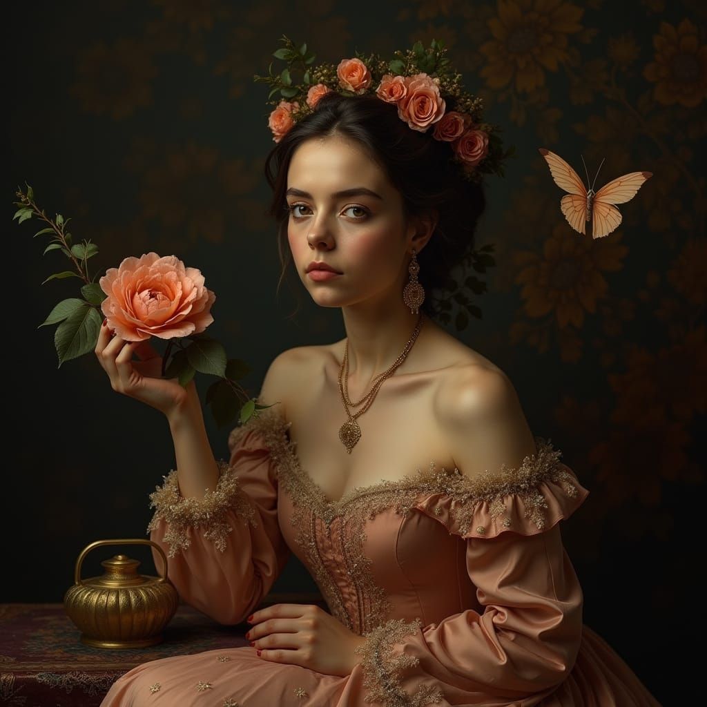 Cenário e Atmosfera: A cena evoca um clima de mistério e sofisticação, ambientada em um cenário delicado e enigmático. A mulher, vestida com um elegante vestido vitoriano de tons profundos, está em um cenário dourado, quase mágico. um objeto antigo com a inscrição "BG". Ela segura um buquê de rosas roxas, ...