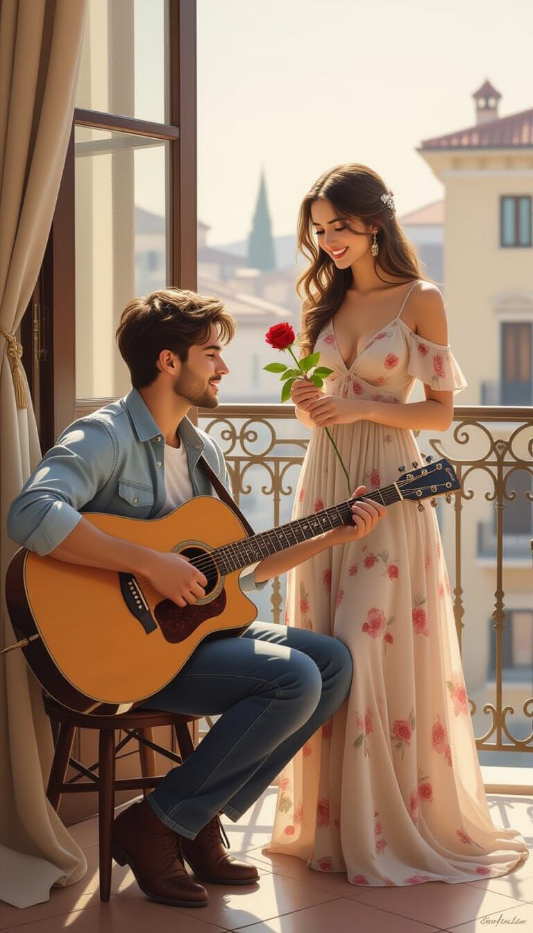 A realistic portrayal of a man serenading a woman on a balcony with his guitar. The scene features warm lighting and intricate details, capturing a moment of tender connection.