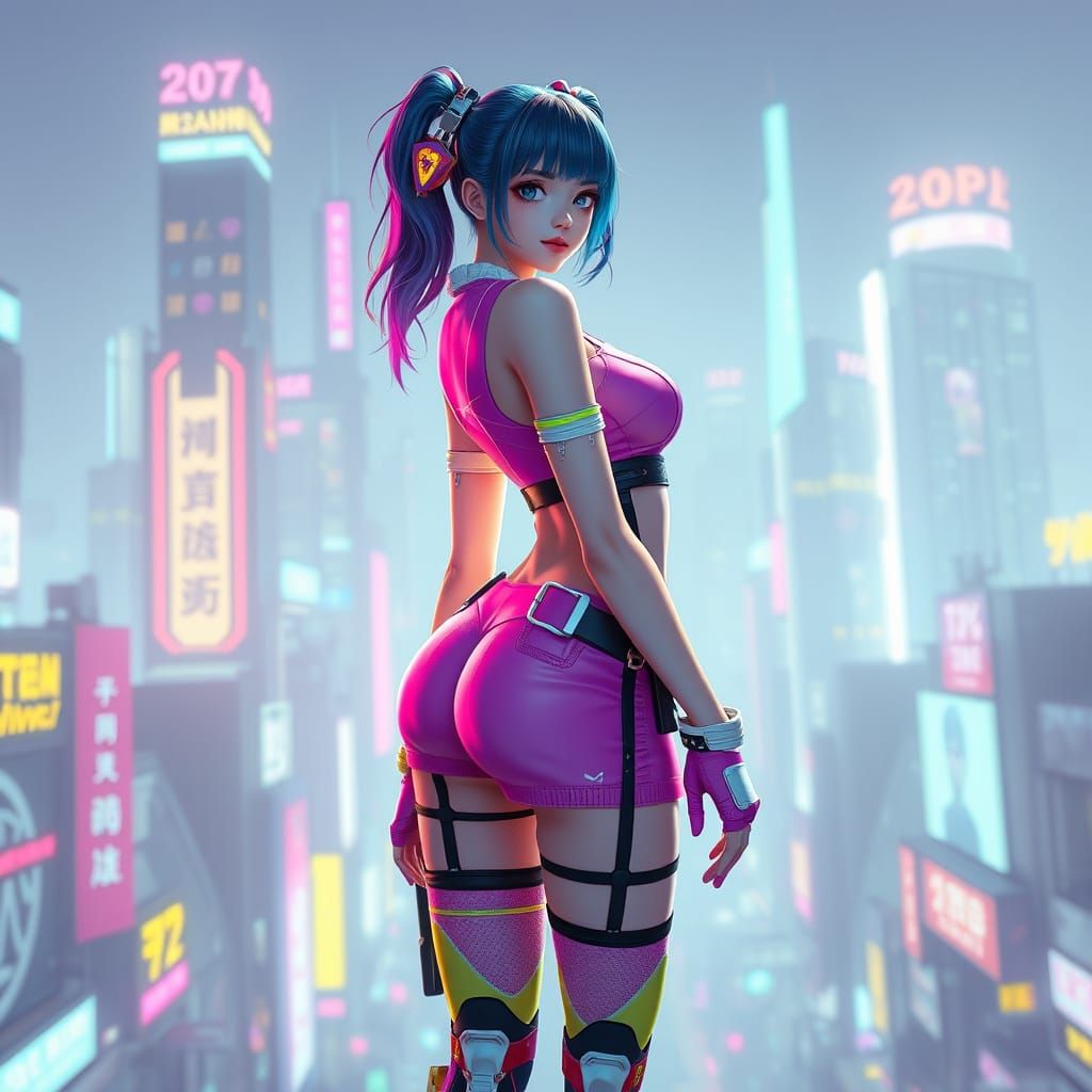 A full body portrait of a cyberpunk idol in a vibrant neon-colored outfit, set against a detailed futuristic city. Rendered in a 3D anime art style.