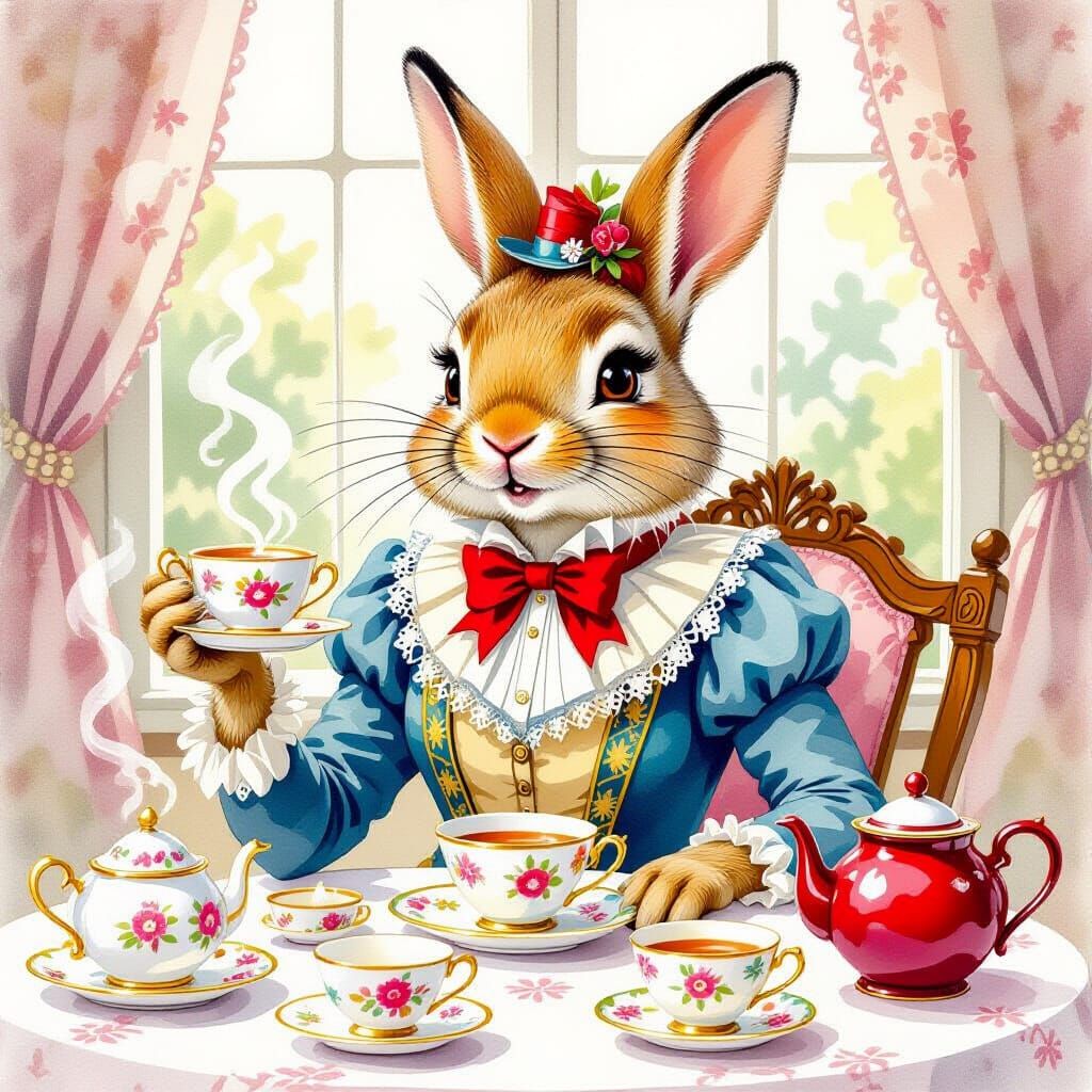 This image shows Dr. Pepper in a vintage outfit at a tea party. The artwork features intricate illustrations and watercolor textures in a storybook aesthetic.