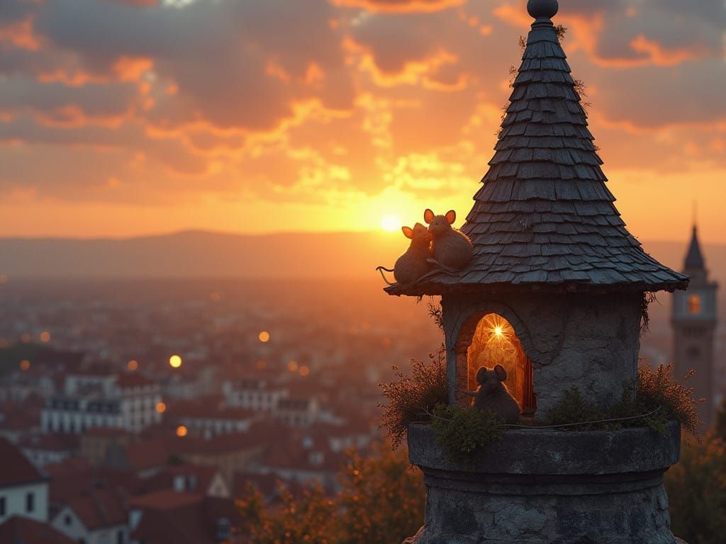 This image shows a mouse family snuggled up in their home, perched on a bell tower, taking in the vibrant colors of a city sunset, captured in a charming, dreamlike style