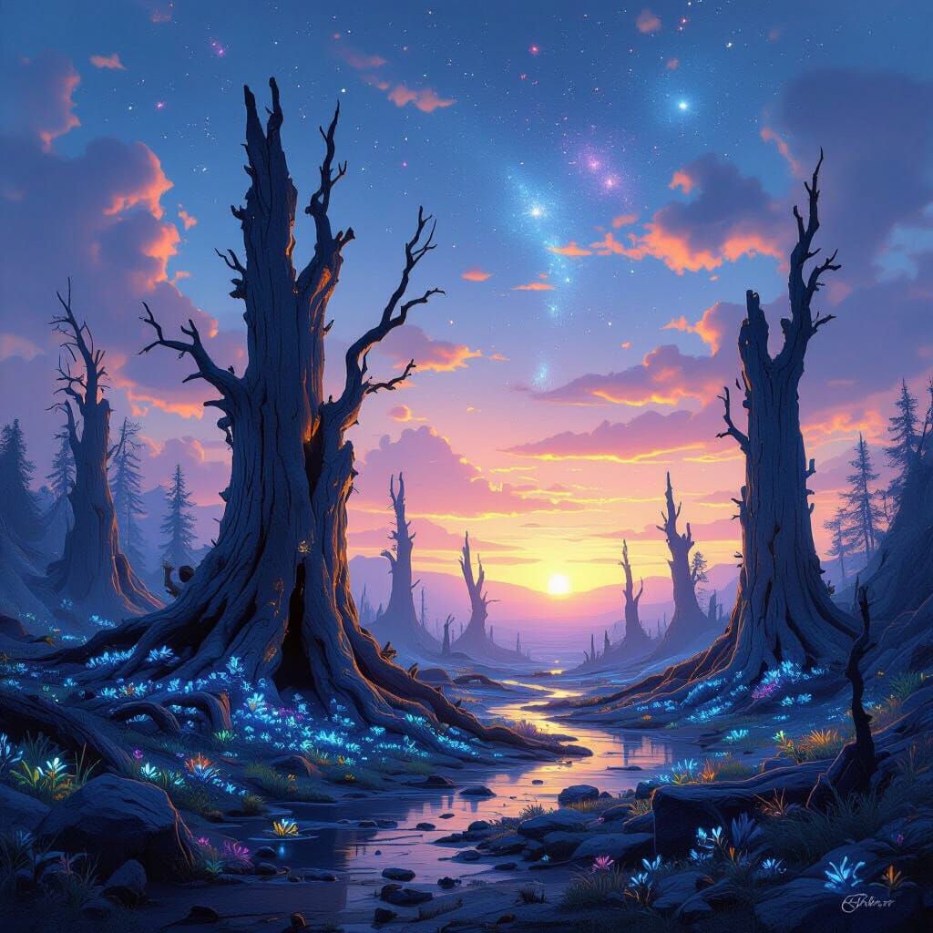 A surreal landscape featuring ancient, petrified trees softly lit by bioluminescent flora at dawn. This image evokes a dreamy and vibrant aesthetic in a surreal style.