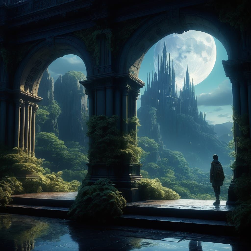 This image features a stunning, intricately detailed glass figure 8 under the soft glow of moonlight, set amidst a lush, futuristic moonscape with a blend of cinematic and anime elements, showcasing a unique fusion of cyberpunk and romanticism.