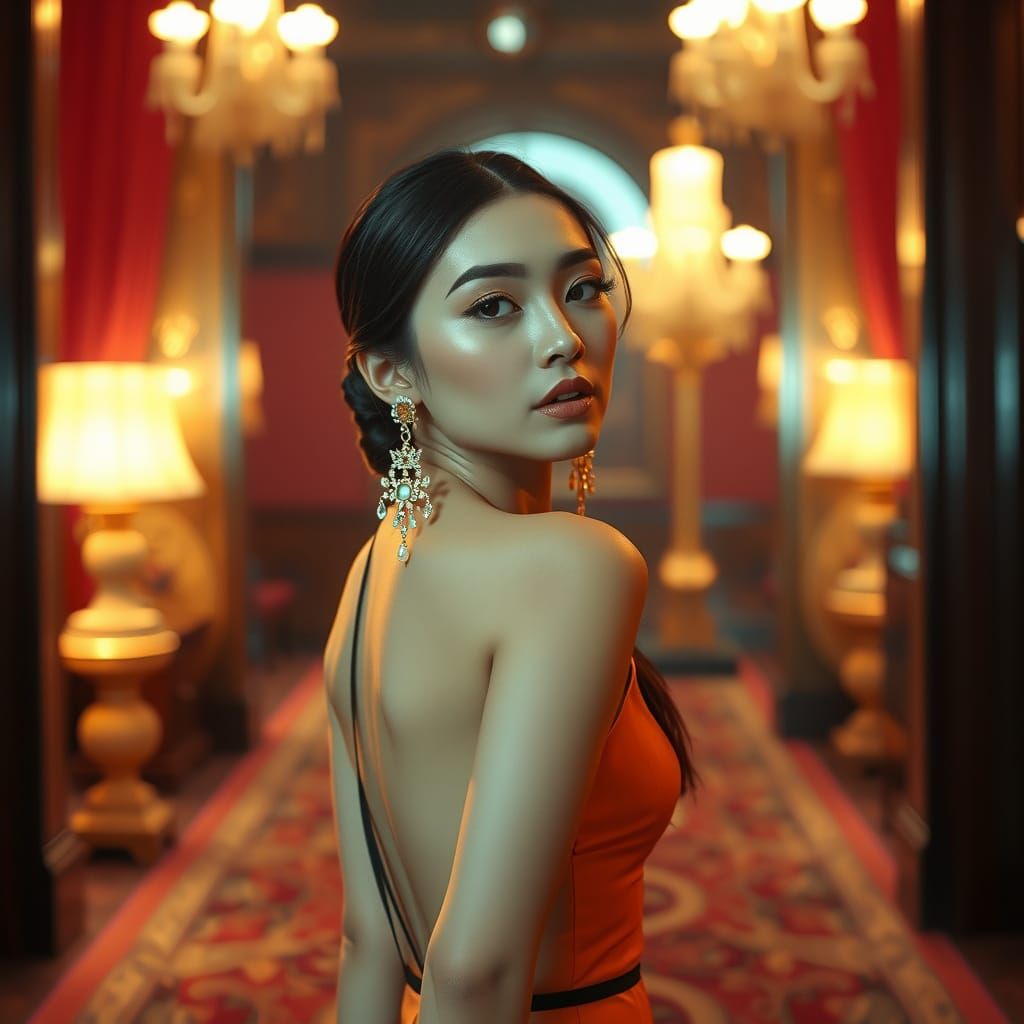 A captivating and sensual oriental woman poses in a luxurious setting. This cinematic image features elegant attire and lighting, with a film-like aesthetic.