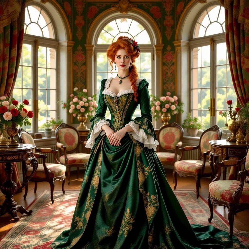 This image shows a Victorian woman with flowing red hair in a green and gold gown. She stands in an opulent drawing-room filled with antique furniture and bathed in soft sunlight, in an art nouveau style.