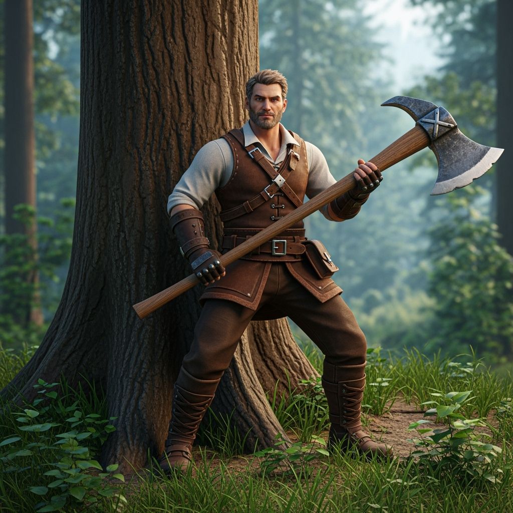 This image shows a robust man in his 40s, with brown hair and a greying temple, wearing leather clothing and wielding an axe. The 3D anime art is reminiscent of Genshin Impact.