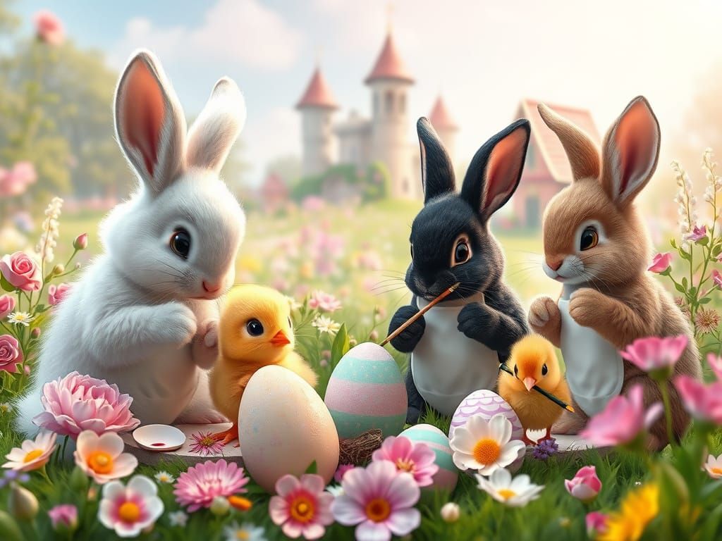 A charming scene of fluffy bunnies and a chick painting Easter eggs in a vibrant meadow. This 3D digital artwork evokes a whimsical, sweet-scented world with hyperdetailed textures, reminiscent of fantasy art.