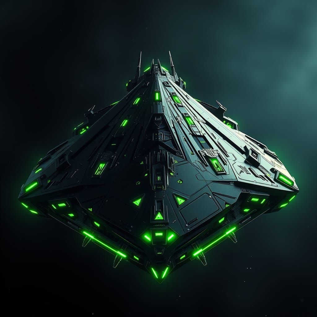 This image shows a futuristic spaceship destroyer with a black hull and neon green accents, featuring intricate circuits and energy conduits. It has a menacing, cutting-edge appearance with razor-sharp fins and angular protrusions, evoking a cinematic sci-fi feel.