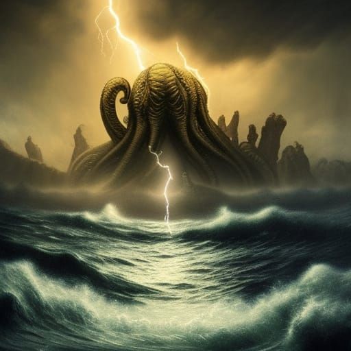 A colossal Cthulhu emerges from the ocean amidst a raging lightning storm. This digital matte painting captures a dramatic, cinematic scene with meticulous detail and an atmospheric, maximalist aesthetic.